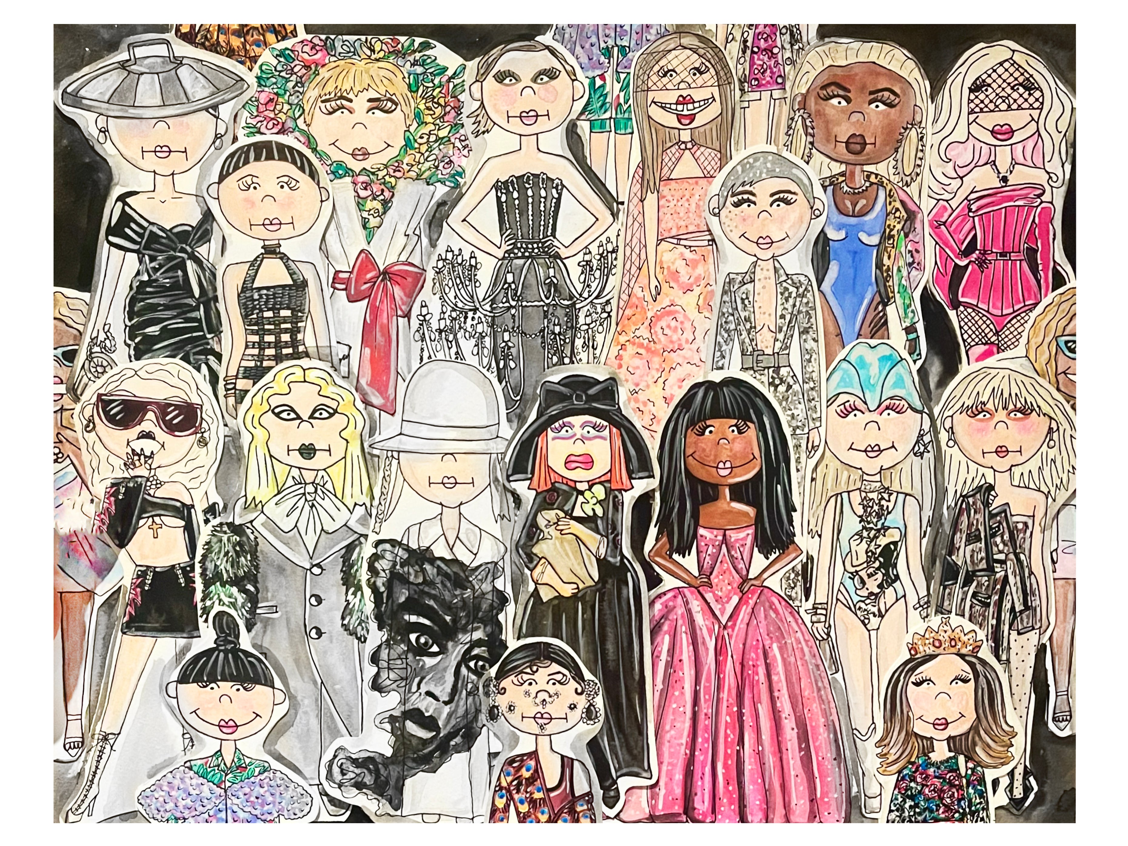 This is an original collage watercolor painting of multiple runway model illustrations on watercolor paper by KahriAnne Kerr. Size 15"x 20". One of a kind original painting.
