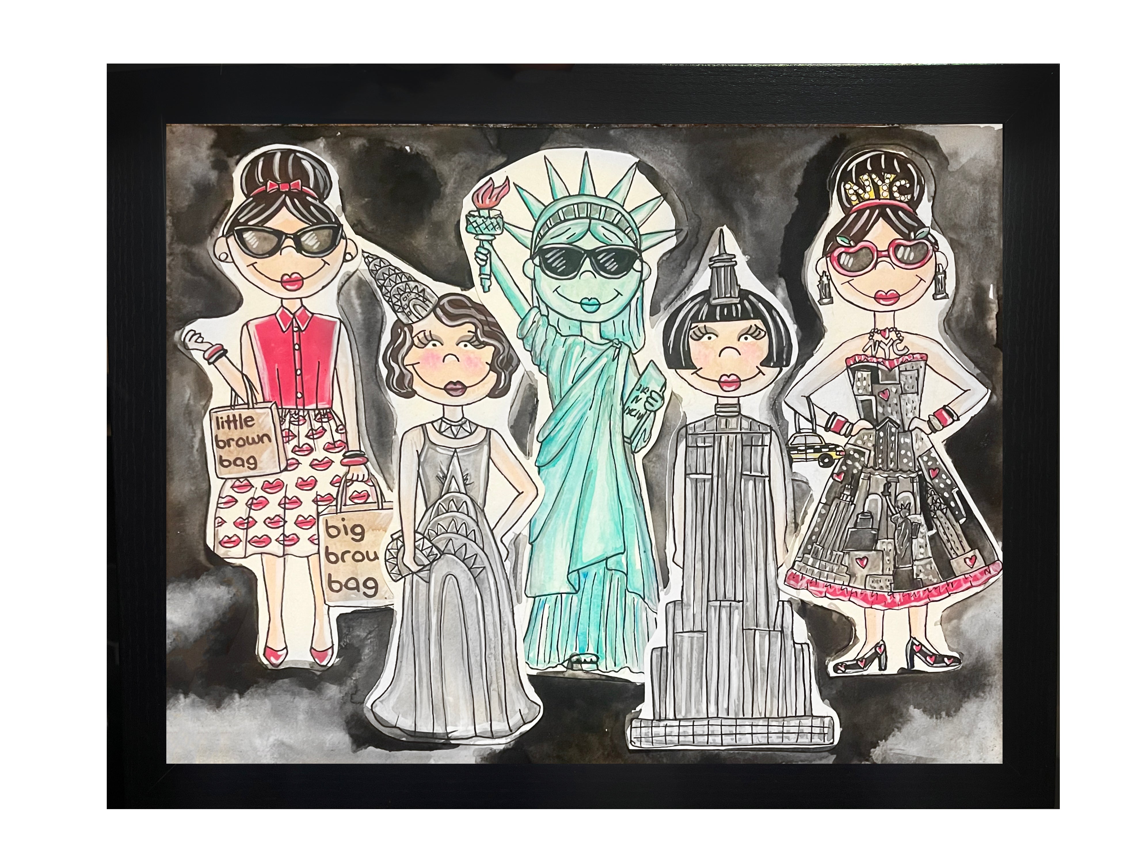 This is an original collage watercolor painting of multiple nyc icons illustrations on watercolor paper by KahriAnne Kerr. Size 11” x 14”. One of a kind original painting.
