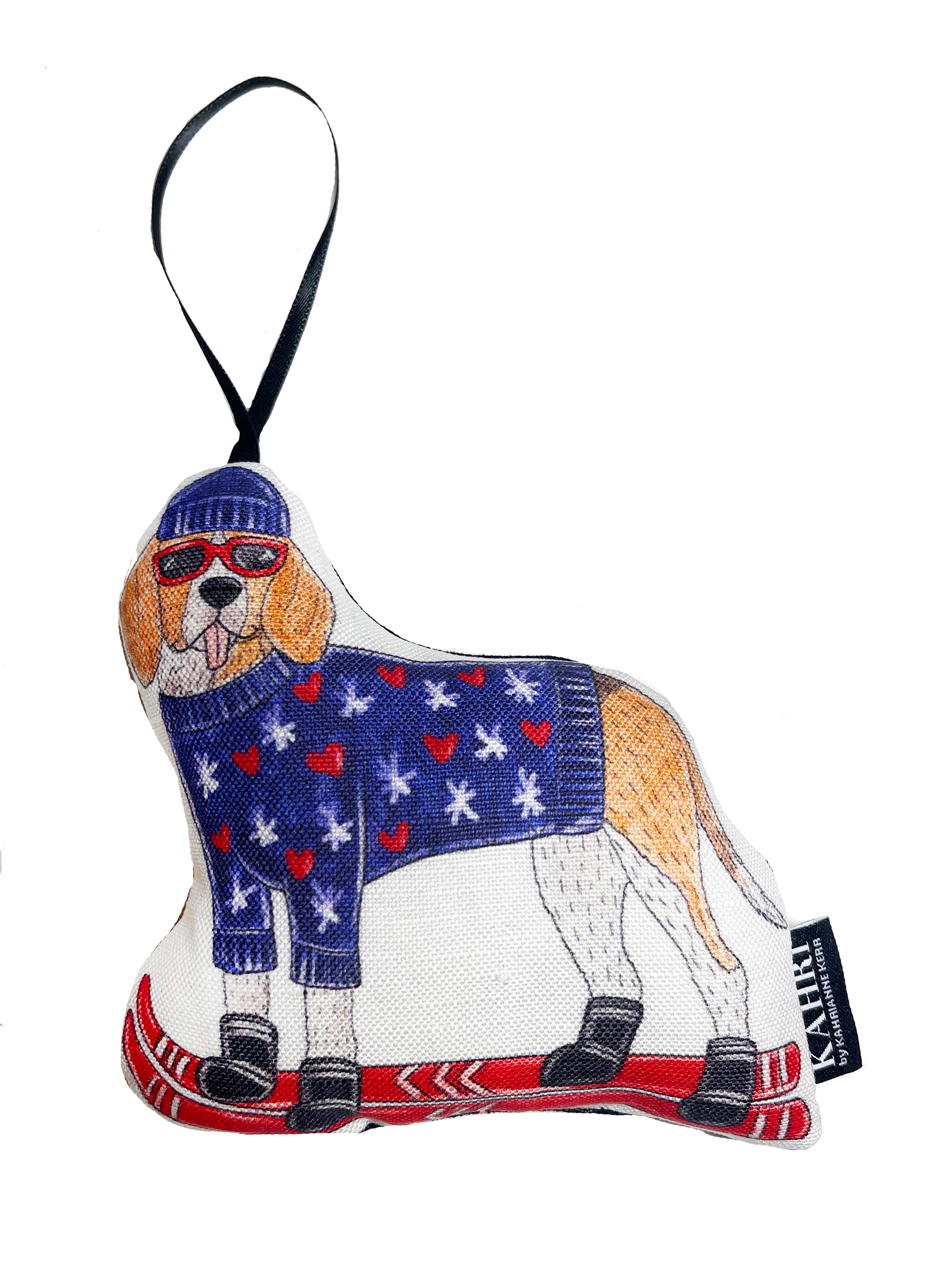 Original watercolor painting illustration artwork by KahriAnne Kerr printed on Linen/Cotton Canvas with solid black linen back and filled with poly fiber fill to create a cute mini fashion doll. 3" black satin loop to hang onto the tree or anywhere. 5" high doll.