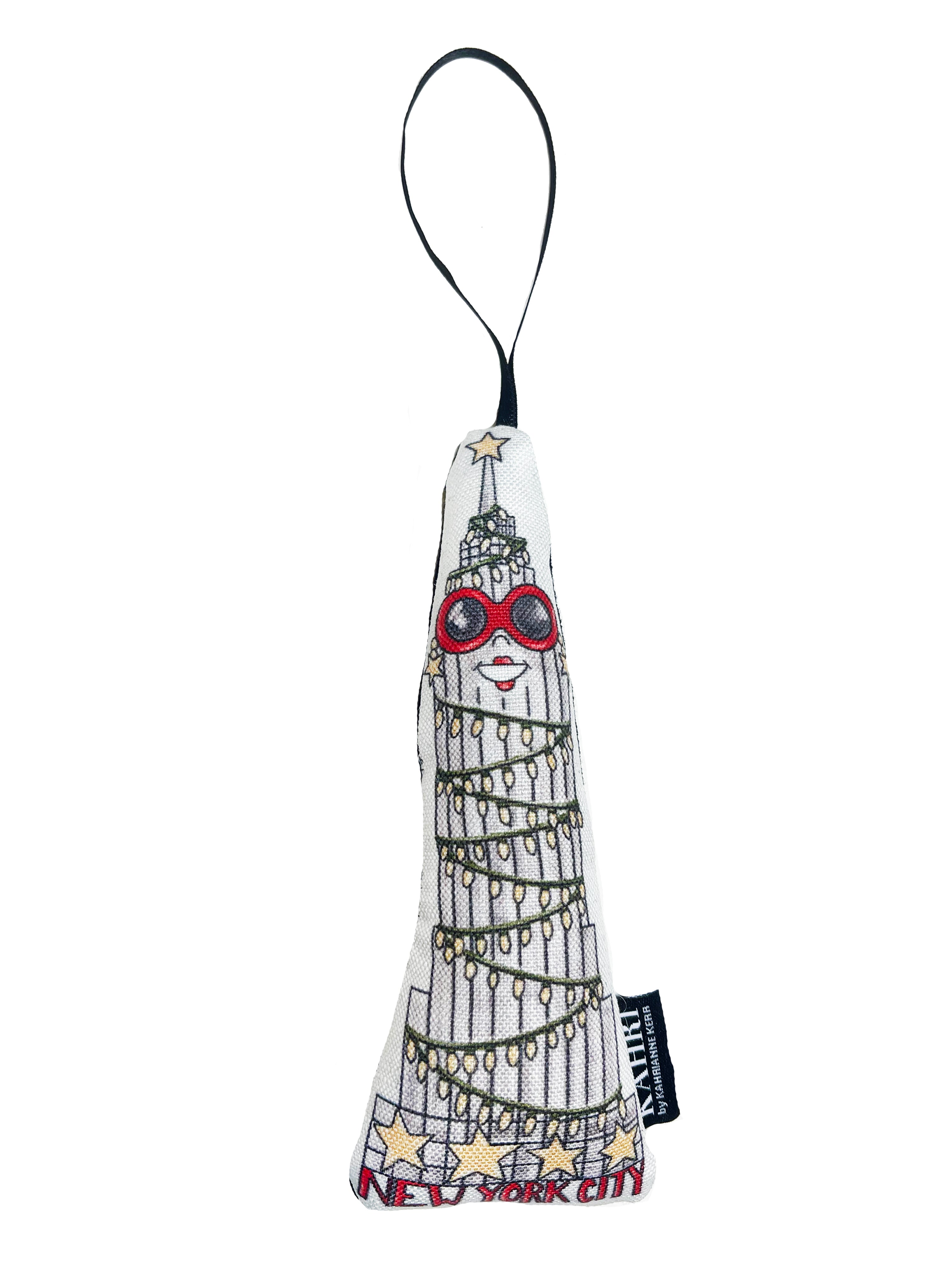 Original watercolor painting illustration artwork by KahriAnne Kerr printed on Linen/Cotton Canvas with solid black linen back and filled with poly fiber fill to create a cute mini fashion doll. 3" black satin loop to hang onto the tree or anywhere. 5" high doll.